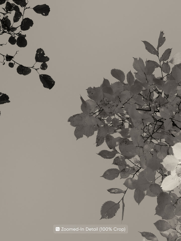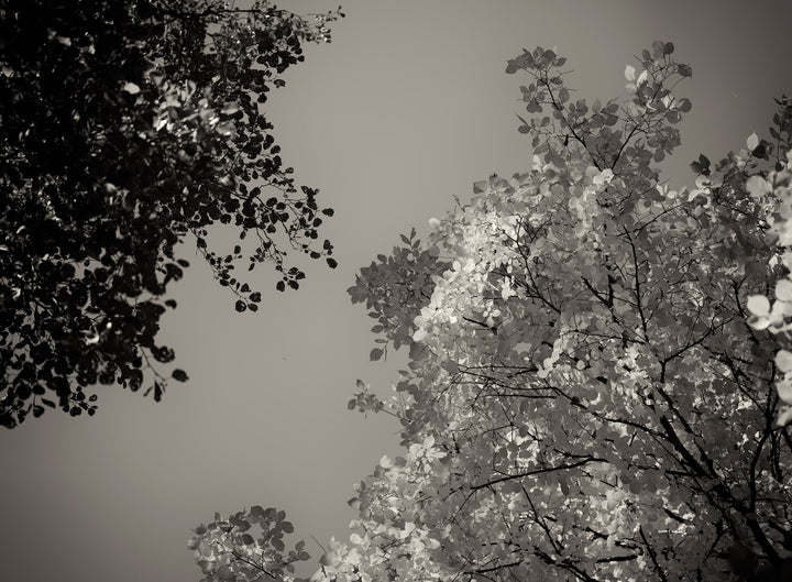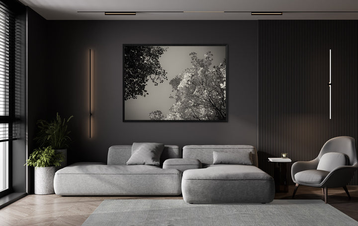 Black and white photograph of tree crowns and leaves against a bright sky. Strong contrasts and clean composition emphasize the natural forms. A fine art print perfect for modern and minimalist interiors.