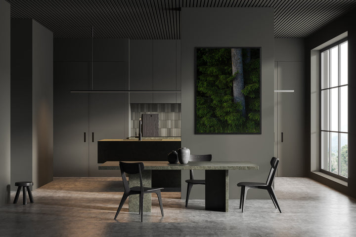 Rich green spruce branches and the textured tree trunk create a sense of natural calm and closeness to the forest. This serene and balanced composition makes a perfect accent for a living room, bedroom, or office, bringing freshness and natural energy into any interior.