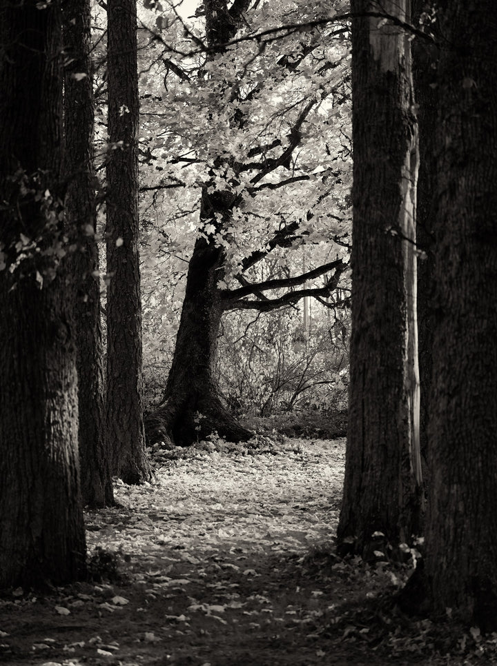 A captivating black and white photograph of the forest: tall tree trunks and a carpet of fallen leaves create a calm and striking composition. This fine art print is a perfect choice for a living room, office, or bedroom, bringing a touch of nature and tranquility to any space.