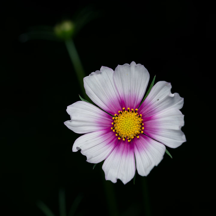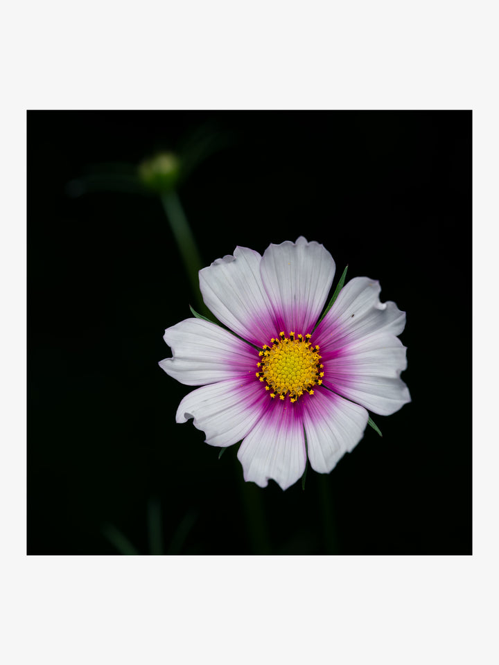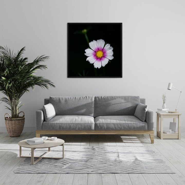 The white petals with a pink gradient and the vivid yellow center of the cosmos stand out sharply against the deep black background. This striking contrast gives the photograph a modern and elegant look, making it a great fit for minimalist and contemporary interiors.