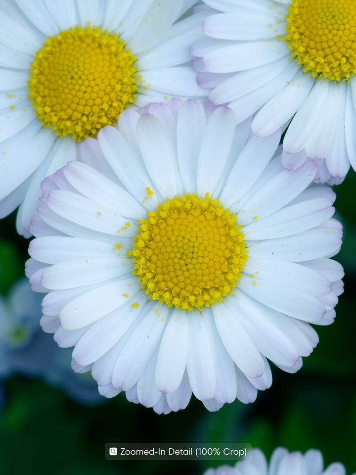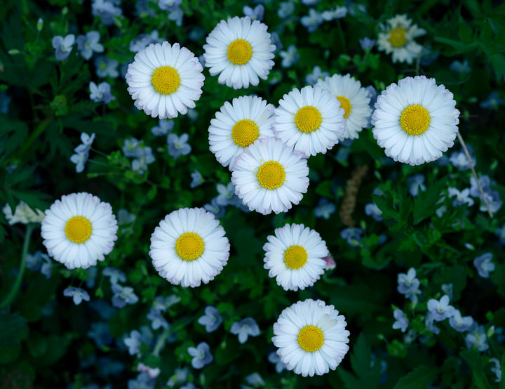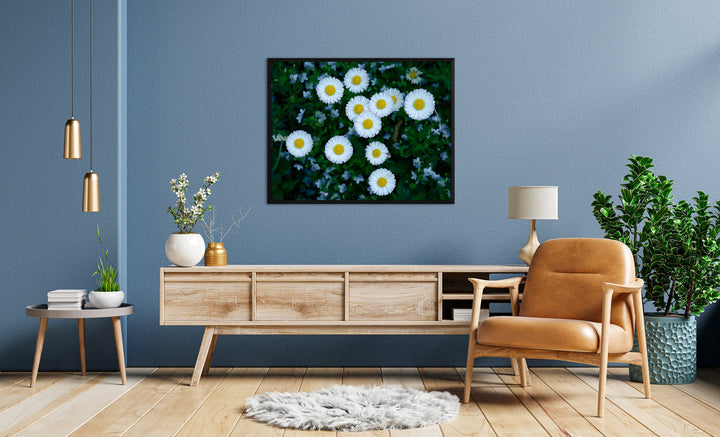 A vibrant photograph of white daisies with bright yellow centers set against lush greenery and small wildflowers. The cheerful summer composition brings freshness and light, making it ideal for decorating a kitchen, living room, or country home.