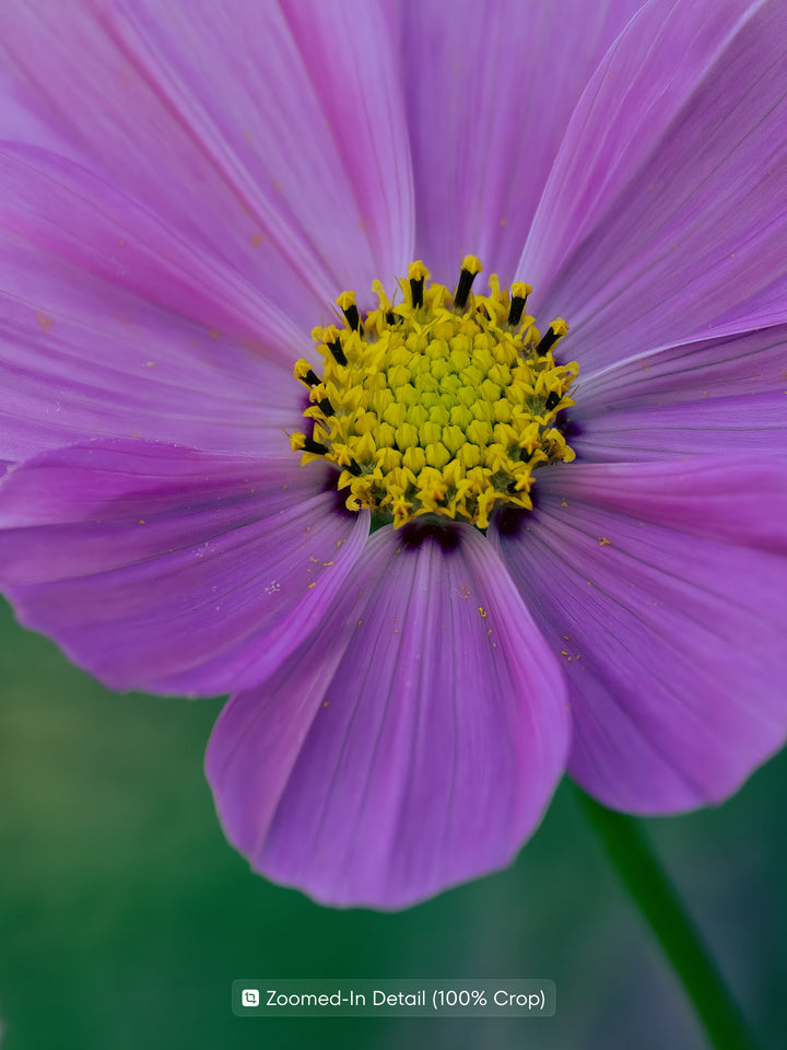 A close-up of a pink Cosmos bipinnatus in front of a soft green background. The natural palette and airy character of the image bring a light and fresh atmosphere, making this fine art print a beautiful choice for a bedroom, living room, or office.