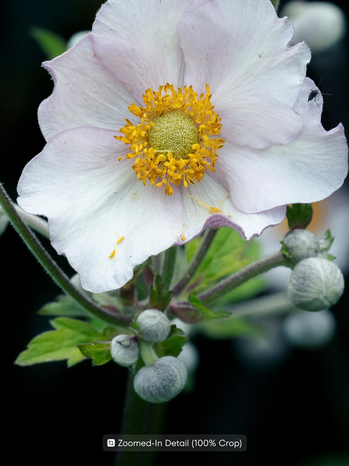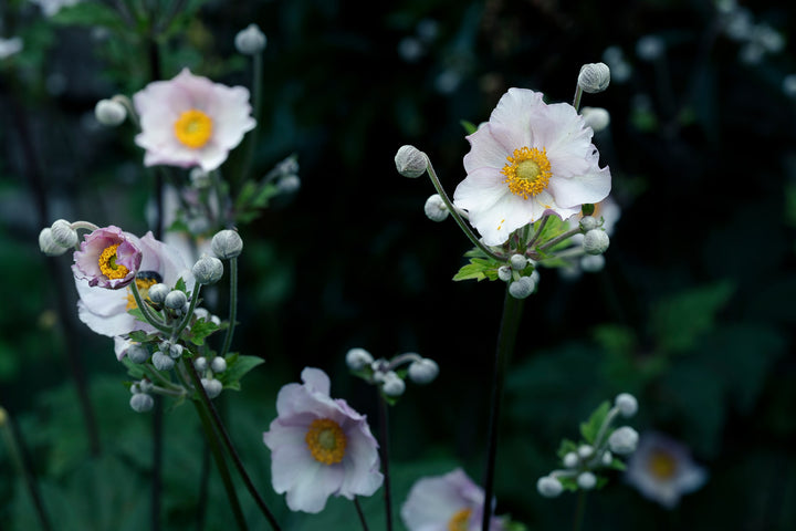 A photograph of the Japanese anemone (Anemone hupehensis) with soft white-pink petals and a golden center against dark greenery. The elegant and airy look of the flower makes this fine art print a refined choice for bedrooms, living rooms, or offices.