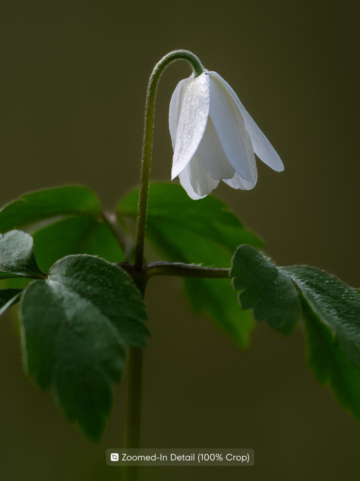 A photograph of the wood anemone (Anemone nemorosa) with its delicate white petals and graceful drooping form. The dark background highlights the flower’s fragility and purity, making this fine art print a refined choice for calm and minimalist interiors.