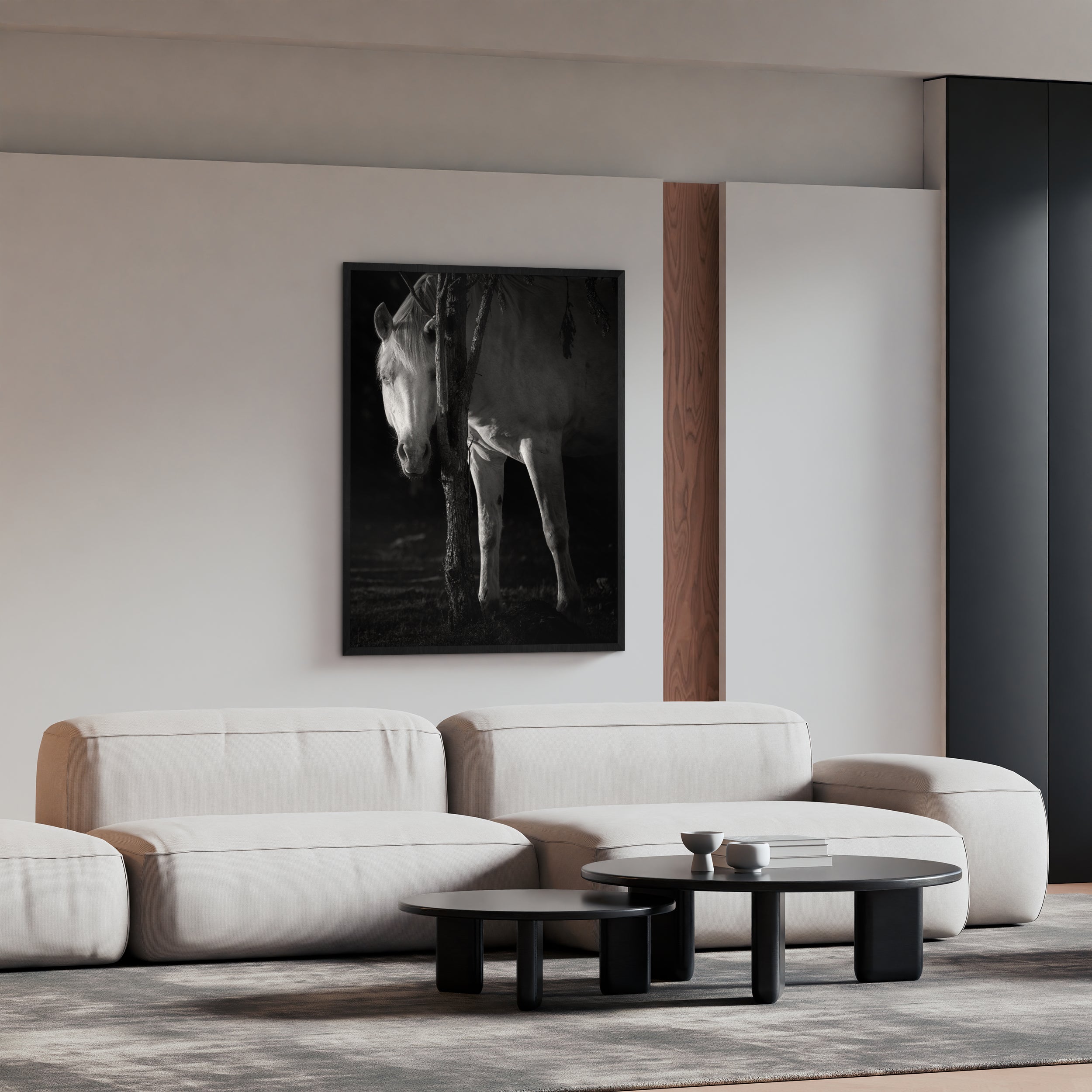 A striking black and white photograph of a white horse standing partially hidden behind a tree. The play of light and shadow emphasizes the calm strength of the animal, creating a minimalist and timeless look. Perfect for modern or Scandinavian interiors, especially living rooms or offices.