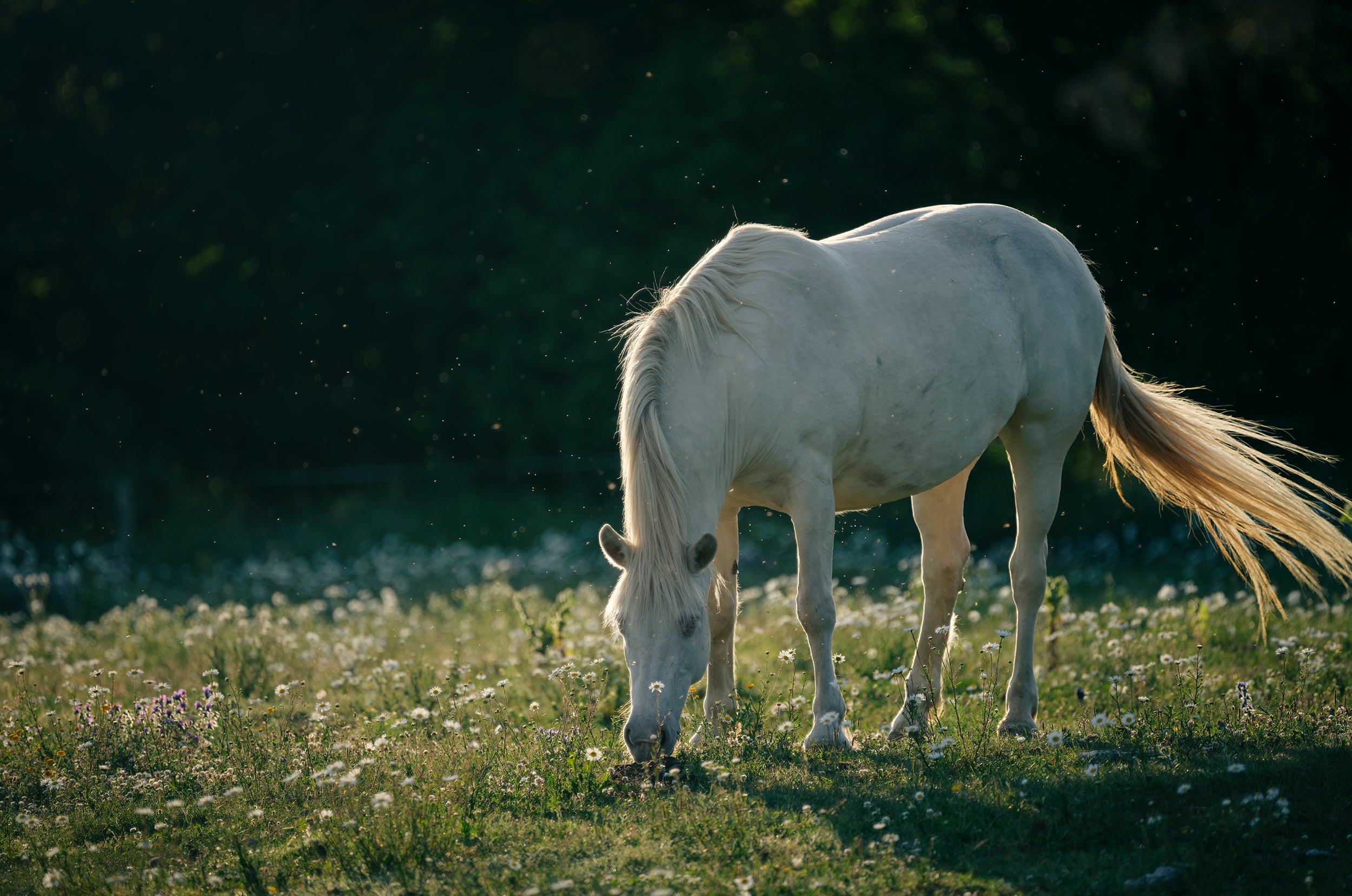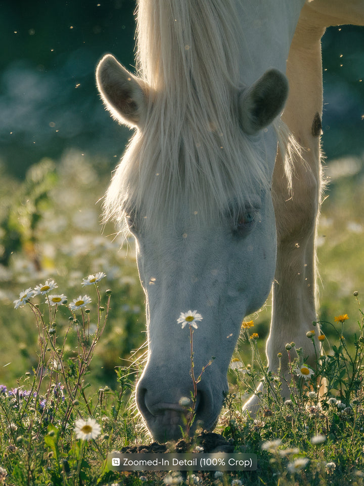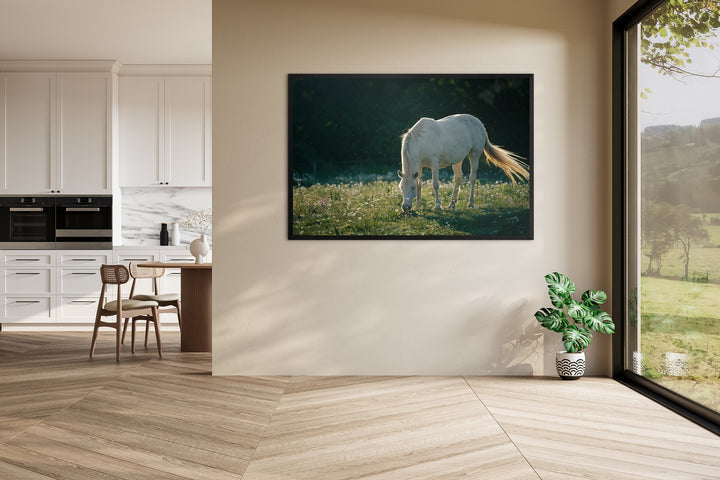 A photograph of a white horse grazing in the warm light of the evening sun. The golden tones highlight its gentle form and evoke a calm, peaceful atmosphere. This fine art print is a perfect addition to living rooms, bedrooms, or rustic interiors.