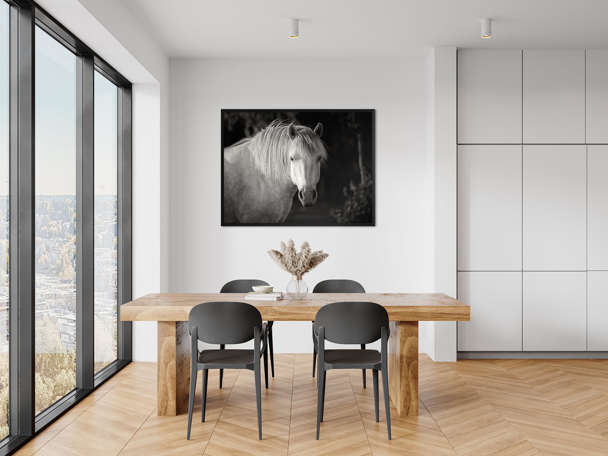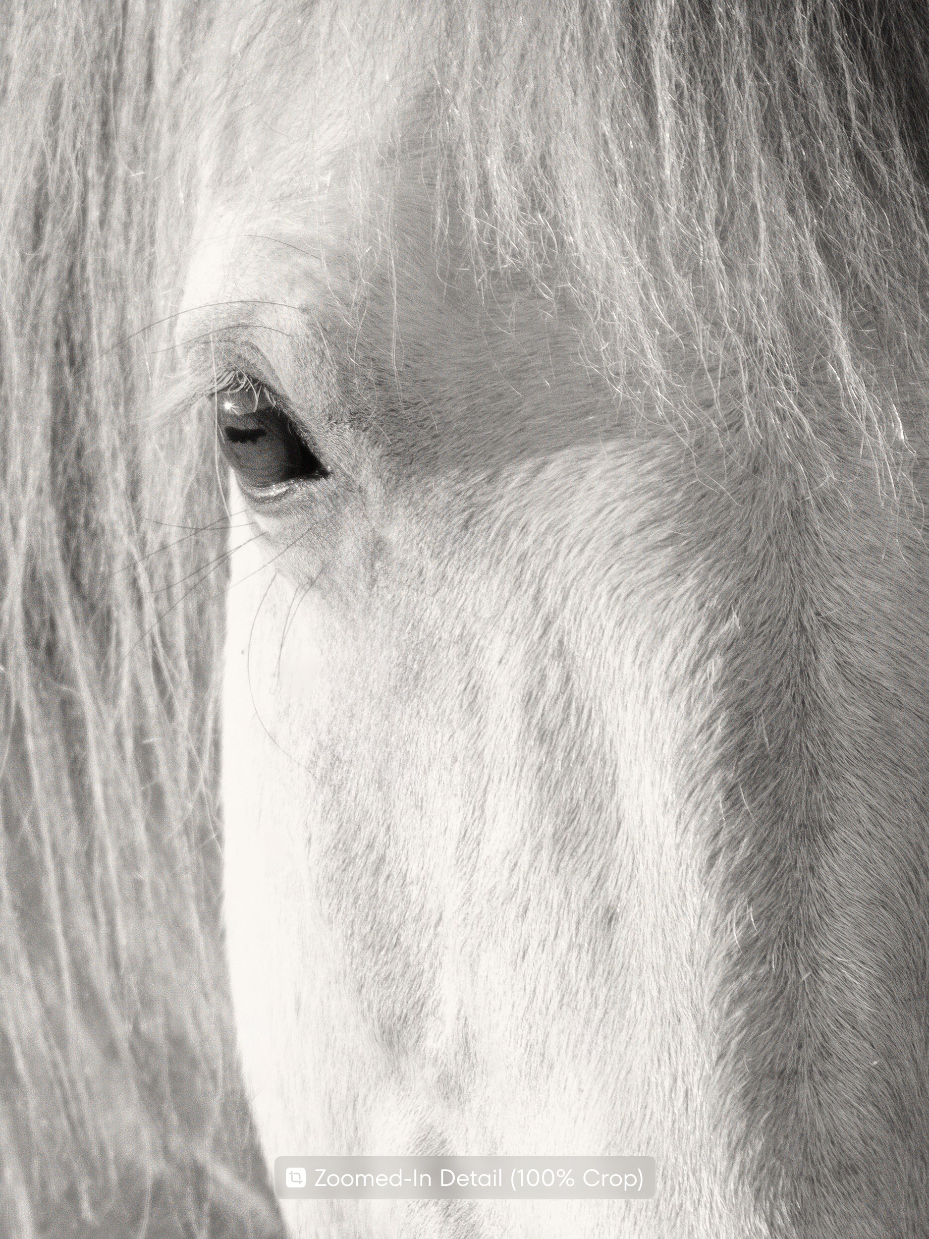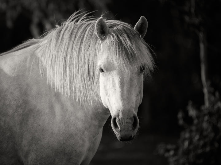 A black and white portrait of a white horse captured in soft sunlight. The image highlights the texture of its mane and the calm, expressive gaze of the animal. This fine art print adds a sense of elegance and balance to living rooms, bedrooms, or office spaces.
