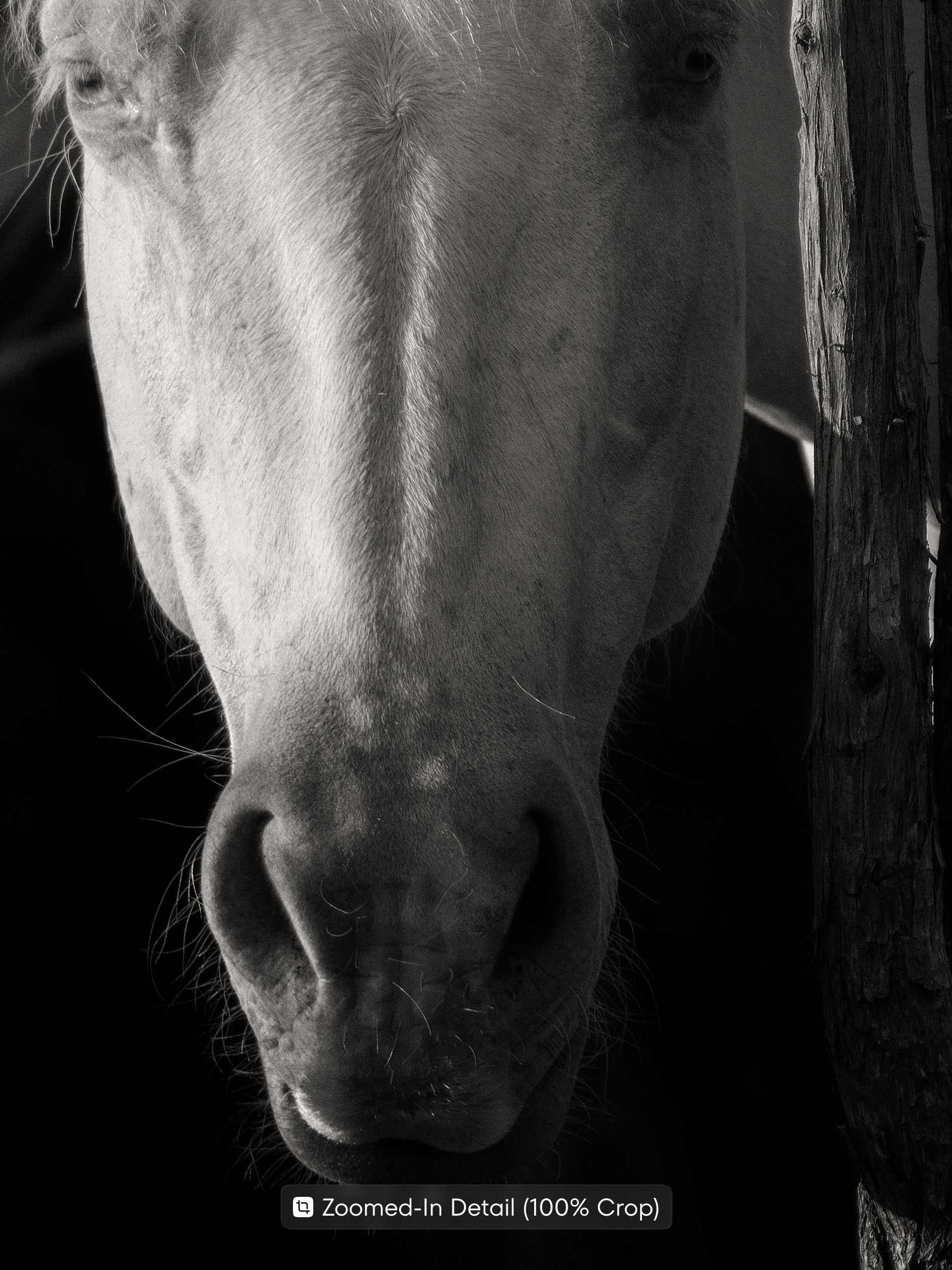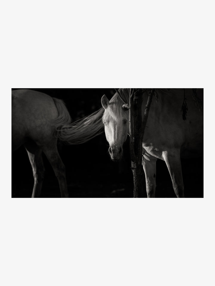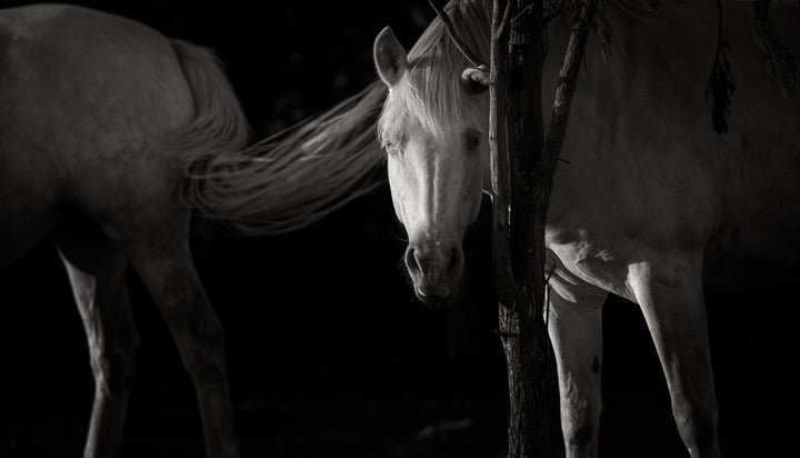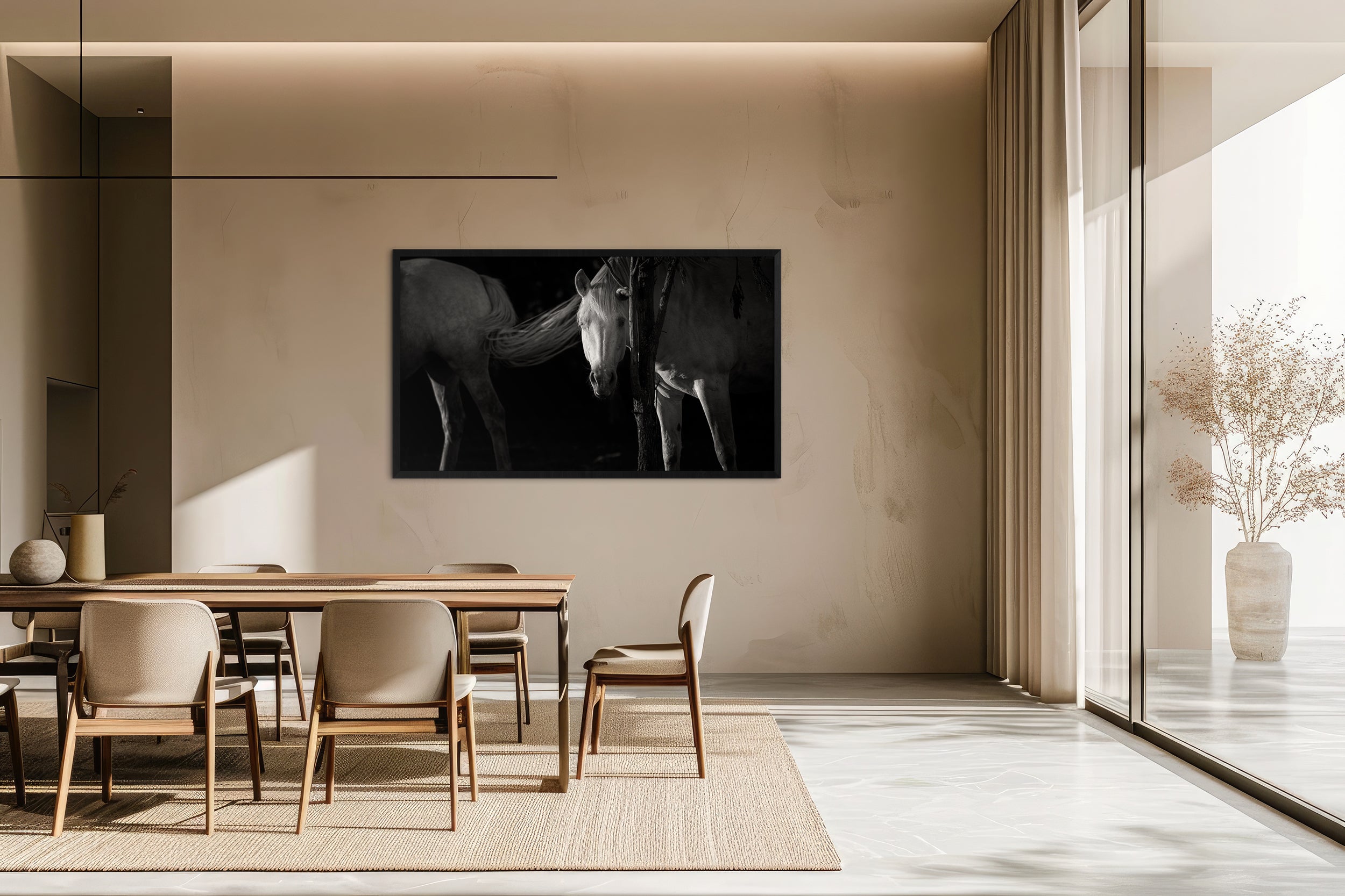 A refined black and white fine art photograph showing two white horses in gentle light. The contrast of bright tones and dark background highlights their natural grace and serenity. A perfect piece for minimalist or Scandinavian interiors.