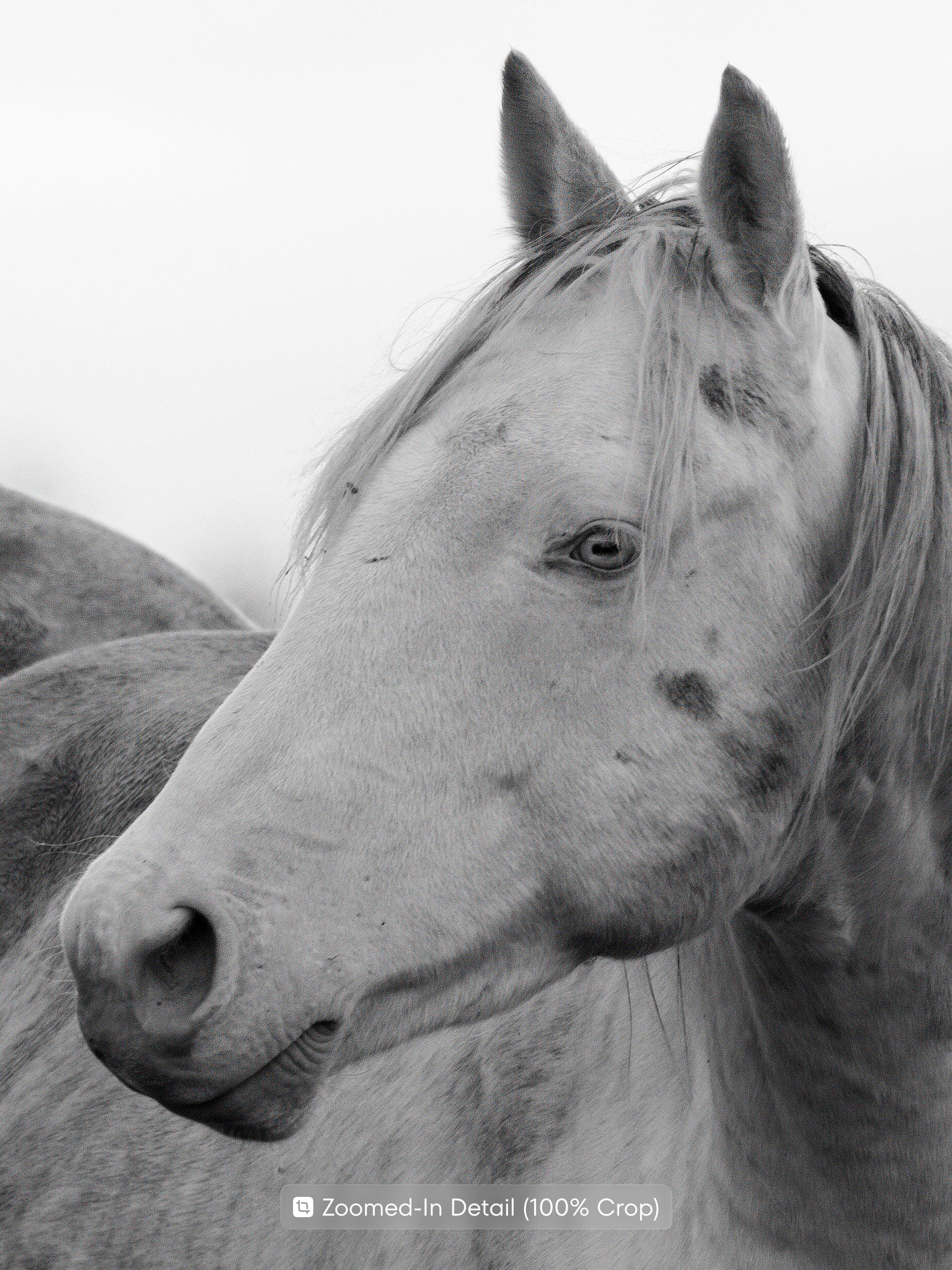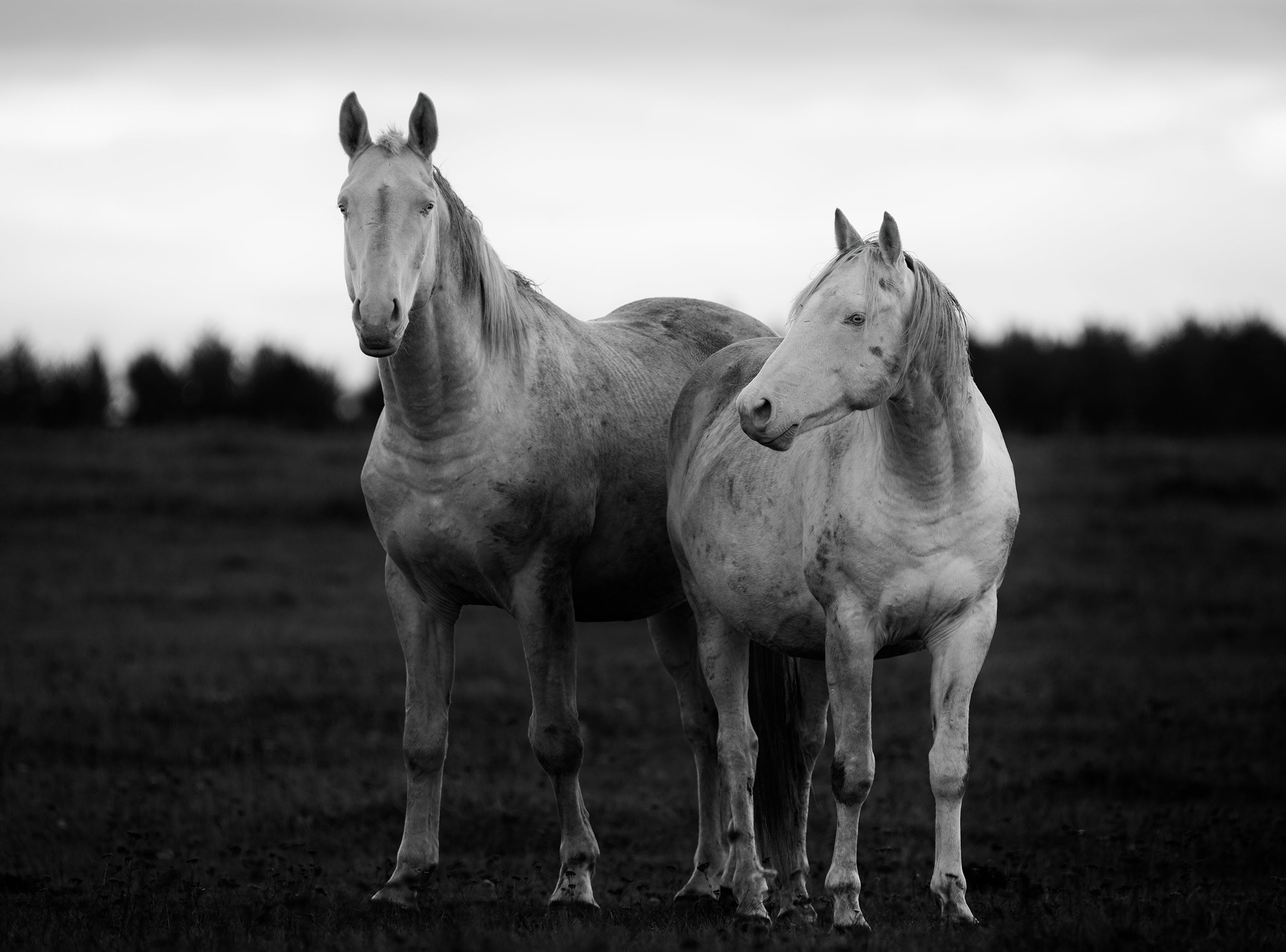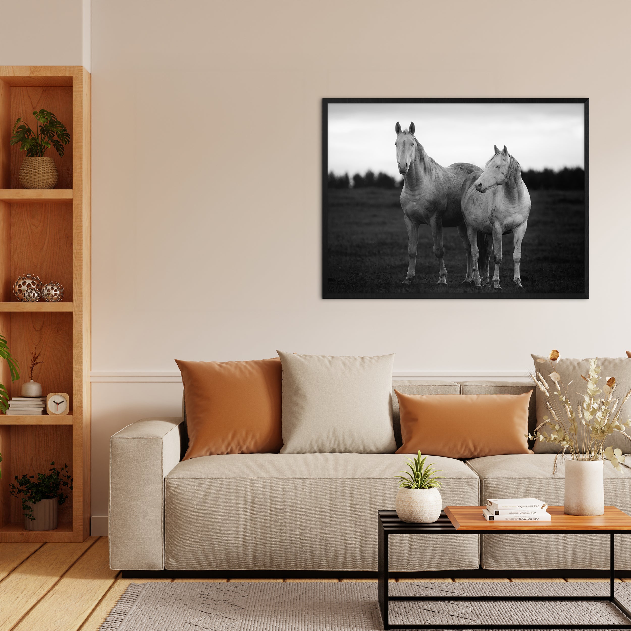 Two white horses stand in an open field under a soft sky. Their calm stance and natural light convey a sense of freedom and quiet connection. This fine art print brings a touch of space and serenity to any modern interior.