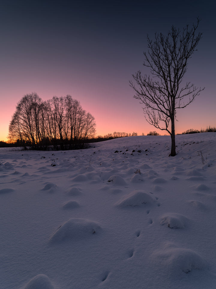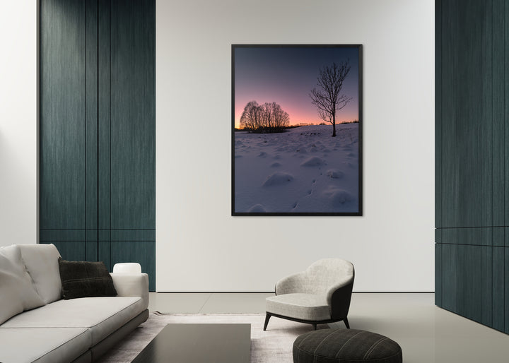 A tranquil winter landscape featuring a snowy field at sunset, with tree silhouettes against a sky glowing in soft pink and violet hues. The warm evening light contrasts beautifully with the cool snow, creating a calm and balanced atmosphere. Perfect for Scandinavian or minimalist interiors – ideal for a living room, bedroom, or office.